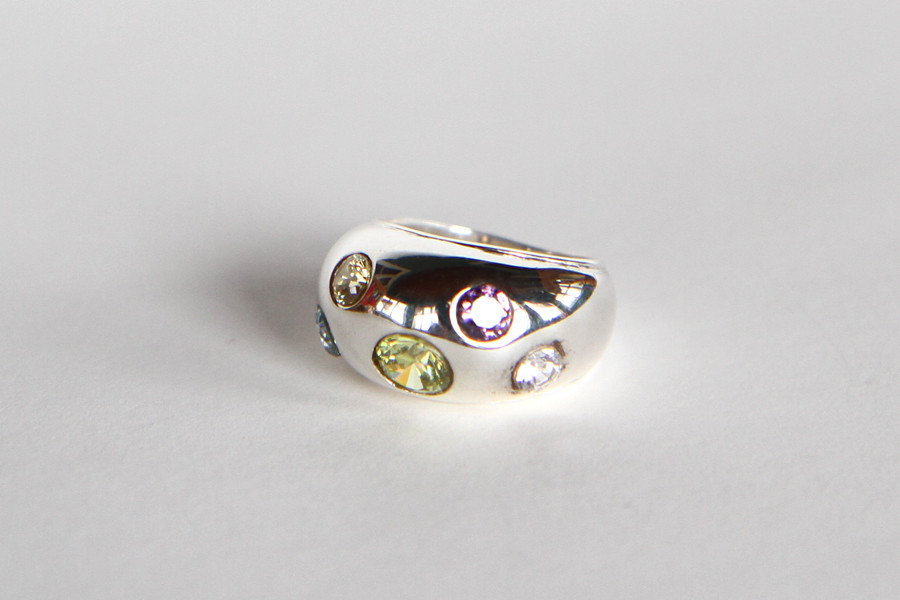 This is an Italian designed Sterling Silver ring with Amethyst, CZ, Citrine, Aquamarine and Yellow Topaz- Size 6